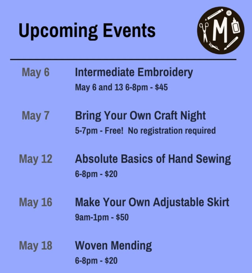 So yeah, I’m excited that we’re going to be doing that next month. And then I teach some of those I’ve taught a couple of different methods of like, some specifically for like mending knitwear, some for different techniques. And then we have someone who teaches some like more traditional kind of visible mending techniques like Sashiko style stitching and like kind of patching with fabric and things like that. And she’s gonna be back sometime this summer, teaching another round of her classes. We will somebody who teaches embroidery classes, which have been really popular and super fun.